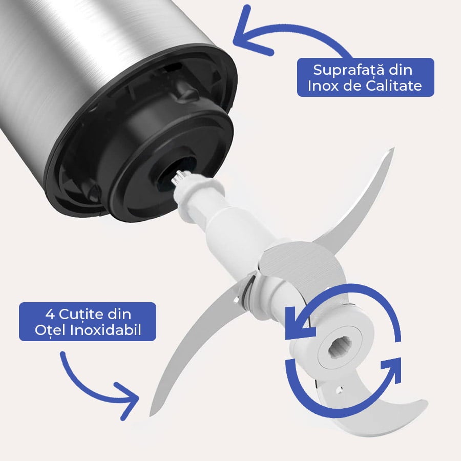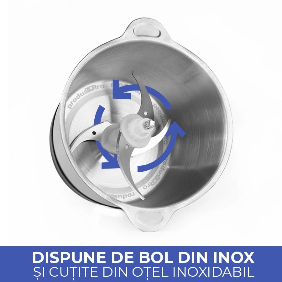 Este construită să dureze, fiind fabricata din inox de înaltă calitate, ceea ce îi conferă un aspect elegant și îl face ușor de curățat. Cuțitele sale, sunt realizate din oțel inoxidabil, garantând tăieri precise și rapide pentru orice tip de carne sau legume. Combinație de materiale de calitate asigură o utilizare îndelungată.